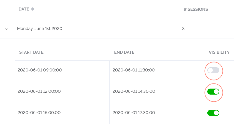 - Select the toggle under the header “Visibility” making it Green for visible and Grey for invisible. This will stop the session from appearing to customers during checkout, but will not delete the session from the system.