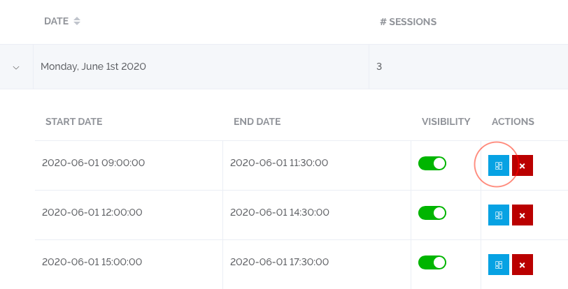 - Select the Blue “Sales” button relevant to the session (circled in red below)