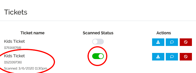 - Select the Grey Toggle, changing it to Green to redeem the ticket